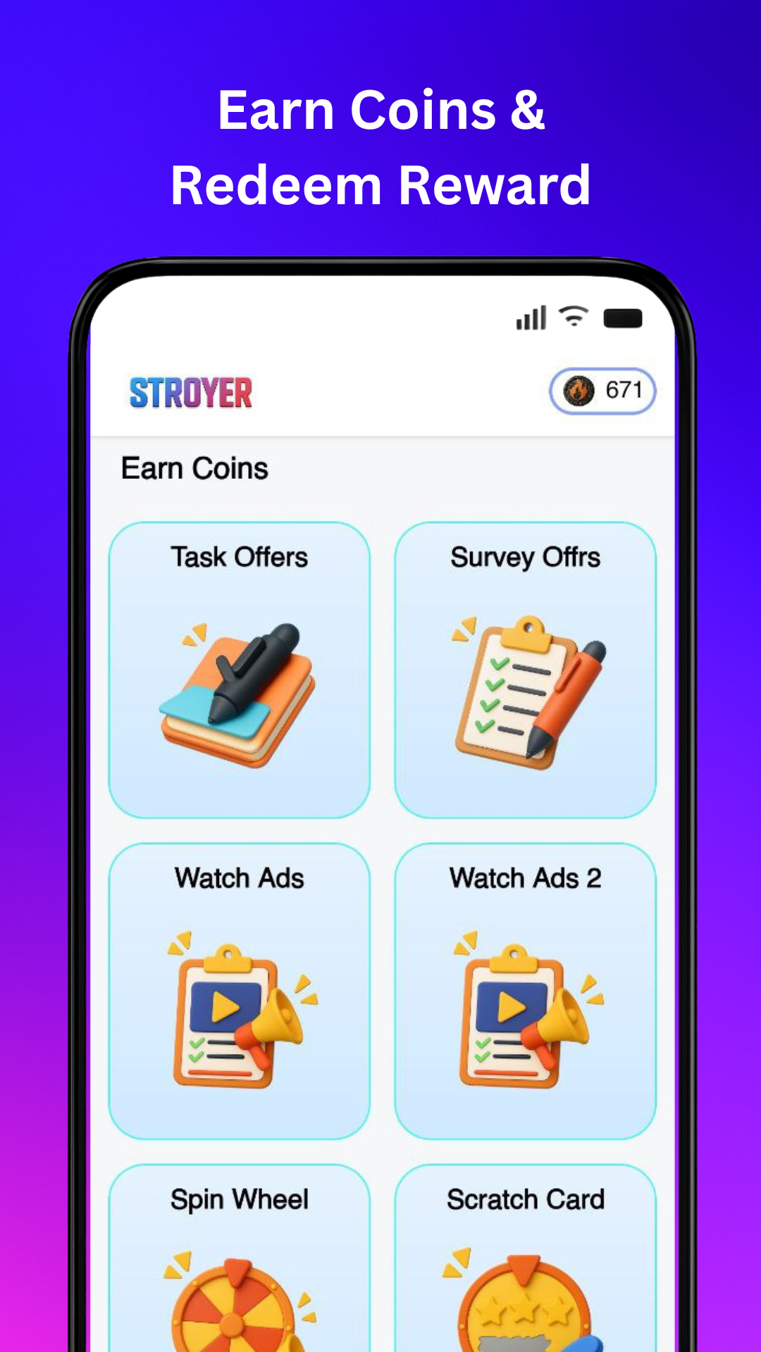Stroyer bundles surveys, rewarded ads, spin wheel, scratch cards, daily bonuses, and mini-games in a single Android app — so you can outsmart idle time and turn it into real UPI cash and game rewards.