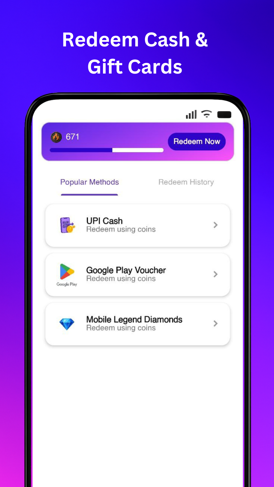 Redeem your coins as UPI payouts, redeem codes, or Mobile Legends diamonds — with transparent thresholds and processing.